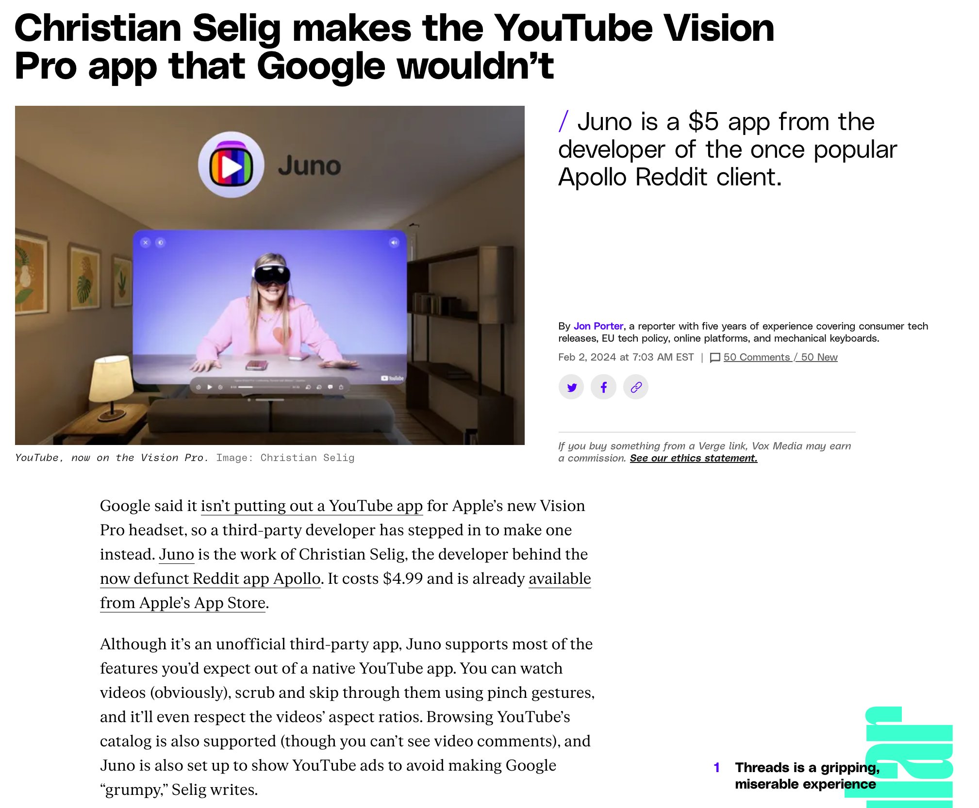 The Vision Show 2024 Youtube – Juno for YouTube was developed by Christian Selig as a way for Vision Pro users to consume YouTube content in an app rather than through Safari. . Here’s a little bit of an about-face: YouTube now says it has a Vision Pro app on its roadmap. I mean this literally, as YouTube spokesperson Jessica Gibby just emailed me the following .