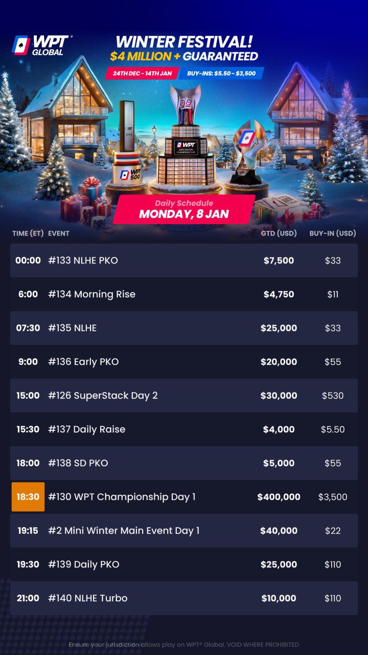 Source : www.pokernews.comWPT Global Poker on X: “Today’s schedule in image version, if you